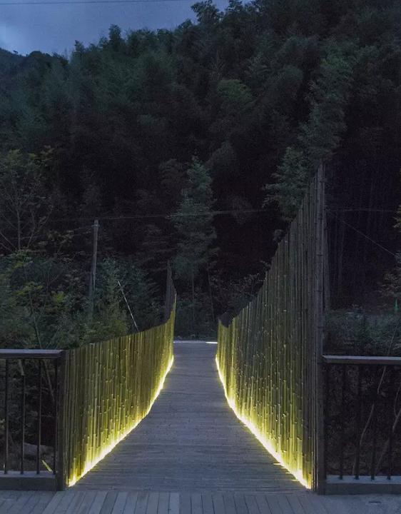 最終,在余姚中村小溪上架起的這座竹橋,僅花了 2.6 萬,其中 2.1 萬人工費,5000 元材料費。它造價低廉卻質(zhì)樸優(yōu)美,僅有 1.2 米的橋身剛好是足夠一人走、另一個人側(cè)身而過的尺度,到了晚上,小橋上安裝的燈帶散發(fā)著微光,為它增添了一分別樣的美感。